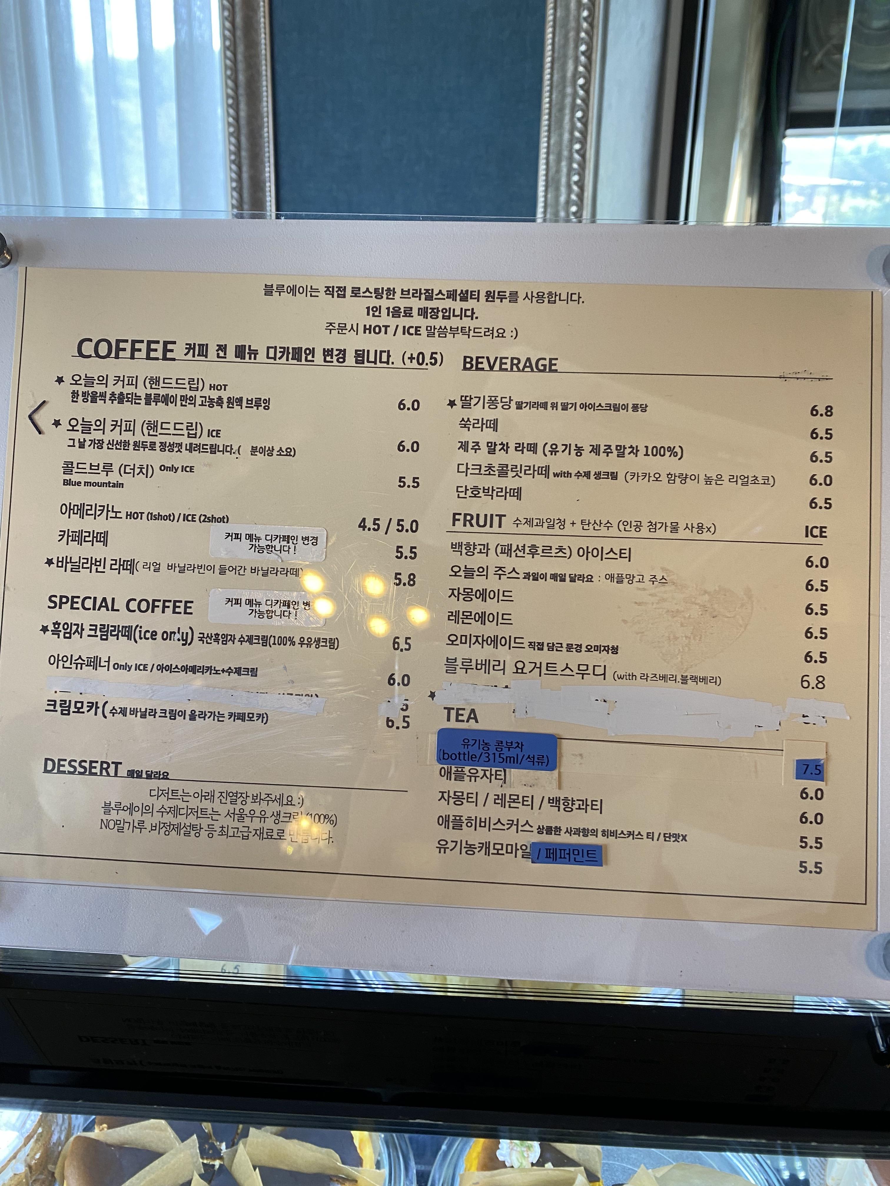 블루에이메뉴판 봉곡동카페 블루에이의 메뉴판이에요.
